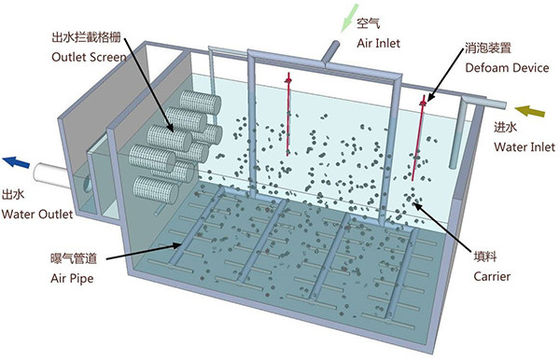 Το απόβλητο ύδωρ περνά από την αναστολή των μέσων αντιδραστήρα MBBR, που διαμορφώνουν τη βιολογική μεμβράνη στην επιφάνεια των μέσων βαθμιαία. Με τη δράση μικροβιακού στη βιολογική μεμβράνη, το απόβλητο ύδωρ καθαρίζεται. Τα μέσα MBBR μπορούν να κινηθούν ελεύθερα στον αντιδραστήρα με τη μίξη του νερού. Για τον αεροβικό αντιδραστήρα, ο αερισμός θα κάνει τα μέσα να κινηθούν για τον αναερόβιο αντιδραστήρα, η μηχανική μίξη θα κάνει τα μέσα move.ithin το νερό.