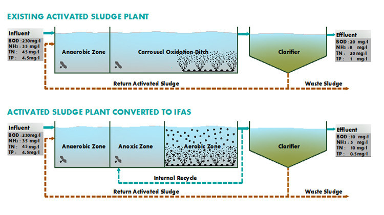 Η τοποθέτηση των μέσων MBBR στις λεκάνες ενεργών αποβλήτων δημιουργεί έναν συνδυασμό ανασταλμένης και συνημμένης βιολογίας αύξησης που βελτιστοποιεί τα οφέλη και των δύο συστημάτων.