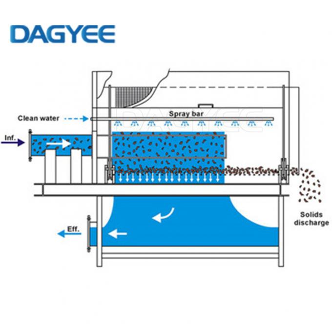 Η απαλλαγή που αντιμετωπίζεται εισάγεται μέσω του διαμορφωμένου τοίχου που βρίσκονται έξω από το σώμα οθόνης, που διανέμεται ομοιόμορφα από τον υπερχειλιστή, και των υπερχειλίσεων στο φίλτρο περιστροφικών τυμπάνων. Τα στερεά θα παραμείνουν στην επιφάνεια περιστροφικών τυμπάνων καθώς το τύμπανο περιστρέφεται, και τα απόβλητα αποχέτευσης που εισάγονται μέσω της οθόνης θα εκτελέσουν την αυτοκαθαριζόμενη λειτουργία όταν περνούν μέσω του κατώτατου σημείου του περιστροφικού τυμπάνου πάλι. Μετά από να περάσει μέσω της εξωτερικής μεταλλουργικής ξύστρας, το στερεό αποσυνδέεται από το περιστροφικό τύμπανο.