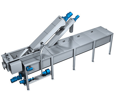 Το νερό που είναι ακόμα στερεόυλικά σε μικρότερα μεγέθη ροέςμέσω της καθίζησηςΔεξαμενή.Τα σωματίδια κατακάθονταιμε το χρόνο και μια οριζόντια βίδαμεταφορέας τα μεταφέρειστη χοάνη συλλογής.